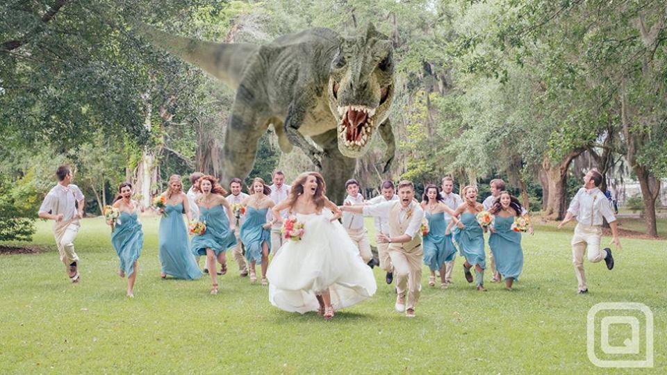 Yes, in case you are wondering, that is the Tyrannosaurus’s penis dangling right behind his right front hand… claw…. thing……… But this seriously is a fun take on the traditional wedding party photo.