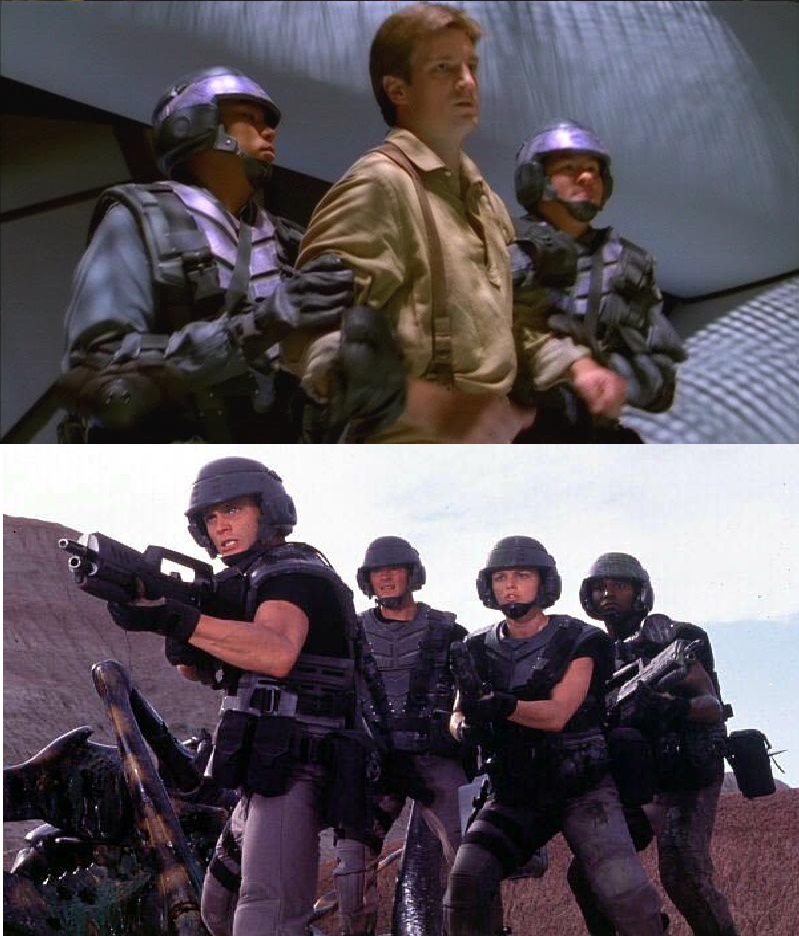 Starship Troopers is my favorite book, hands down.  I’ve read it at least a half dozen times.  Robert Heinlein crafted a fantastic science fiction universe, and the centerpiece of that universe is the Mobile Infantry, with their suits of powered armor.  These suits protect the infantrymen and provide them with enhanced strength, sensory perception, communications, and weaponry. These suits are described in the book as looking like giant, armored gorillas. Of course, this is not what appeared in the film. Instead, it was a box office disaster that didn’t have powered armor at all. That being said, the movie has some redeeming qualities as a B movie and I was willing to accept the movie for what it is—that is, until I saw the special features.  In them, director Paul Verhoeven spoke very excitedly about what he was planning to do with the suits.  Special feature interviews with Verhoeven show various concepts of what the suits might have looked like and, while they were all very different, they were all really cool looking. Instead we got really crappy body armor (This same armor made an appearance in episode two of Firefly).  Had I never seen Verhoeven’s original vision, I would have never expected anything other than the final movie version.
