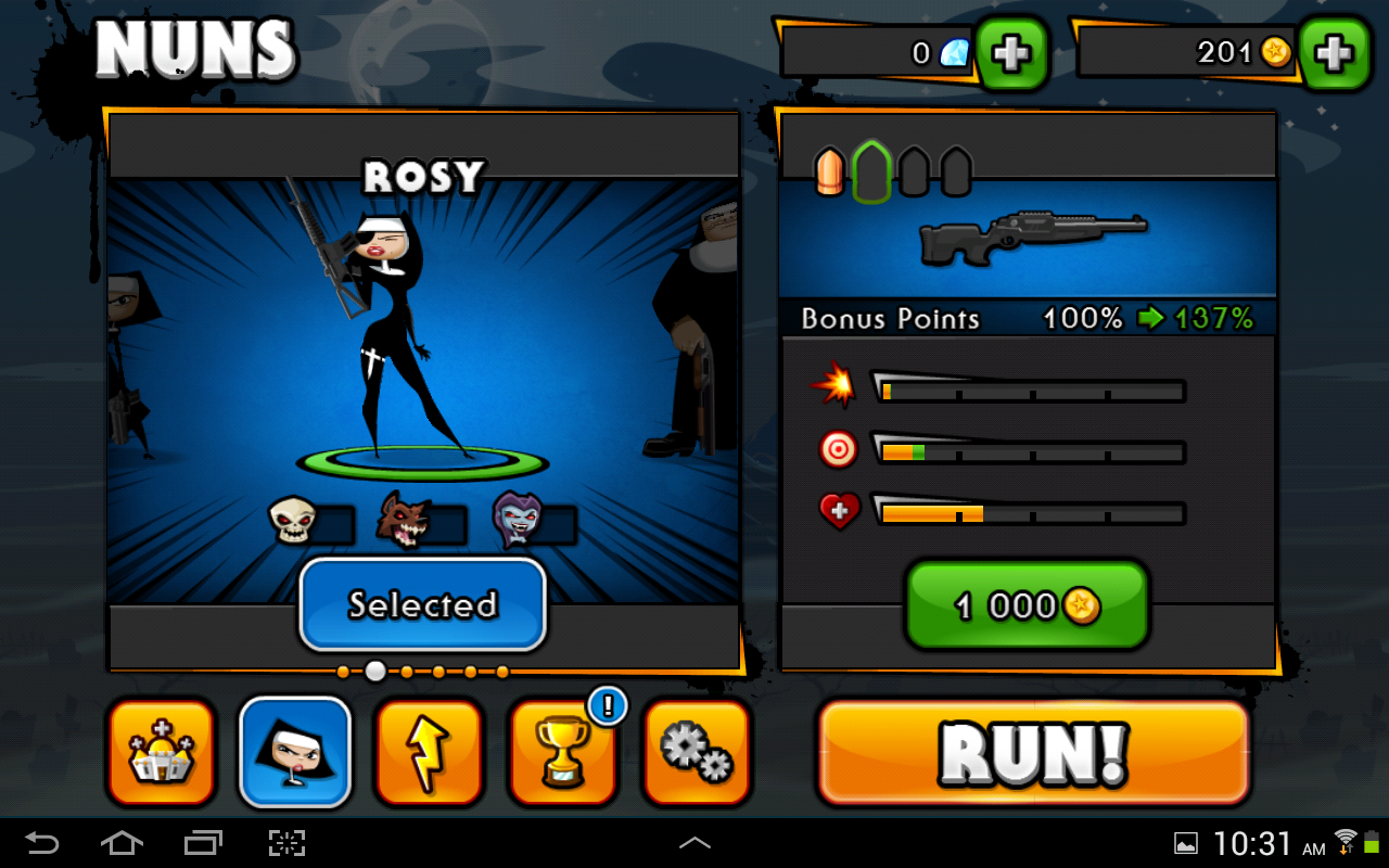 As with most mobile games, this game relies on in-game purchases for revenue. Fortunately, it appears that jewels/diamonds are only used for free revivals (pun intended) for the nuns. Unlike many games where jewels are required for leveling up, it would appear that it is unnecessary to spend money in this game to fully enjoy it. Most upgrades to weaponry, etc, are purchased with coins, which are earned in gameplay. That’s a huge plus for someone like me. It’s also nice that these coins are generously distributed. From time to time, the nun will run into a portal, which will take her through a strange rip in the space-time continuum which for whatever reason has been filled with coins.