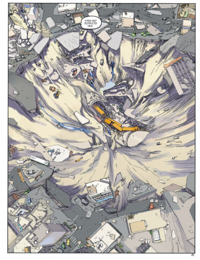 The art in this book was surprisingly whimsical, given the story’s plot. The robots look almost like toys in most views. Most of the angles of the frames make them look smaller than they actually are. Bengal excels at including surprisingly precise details that frame the city and make the story more real, such as a full page panel that shows a detonation crater. The explosion has opened a hole in the ground that reveals the city’s subterranean levels—including a subway train and tracks.