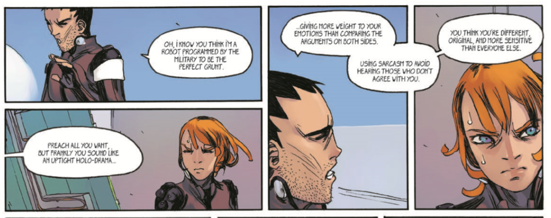 While I don’t require all my entertainment to have deeper meaning, I am perpetually surprised and pleased when a graphic novel such as this one transcends the expectation for its genre and probes a controversial subject. In this case, Moran creates a pair of humans with diametrically opposed world views. Lieutenant Llamas is a conservative, pragmatic man who is willing to sacrifice the few for the good of the many. Corporal Onoo, on the other hand, is gentler and more empathetic. She sees the pain of the people whose lives and loved ones have been destroyed in order for the Meka pilots to save the rest of humanity.