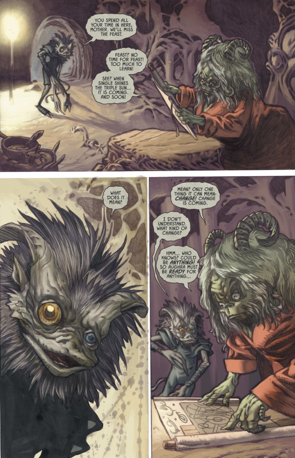 More than anything else, Jim Henson and his Creature Shop are known for a visual style. Given that comics are a largely visual medium, it makes perfect sense for this to be the format for The Dark Crystal: Creation Myths, if the level and quality of style of the original can be matched. Thankfully, Alex Sheikman and Lizzy John are up to the challenge. The artistic duo was able to capture the visual style of the movie without making it feel like they are just copying from it. There is a great sense of wonder captured in these panels that fits the concept of creation myths beautifully. Sheikman and John also do a great job in making the characters feel like Henson creations. The ways they move and hold themselves gives a sense that they are other-worldly. The character Raunip does this especially well and I repeatedly found myself trying to figure out how he got himself to move or bend in a certain way.