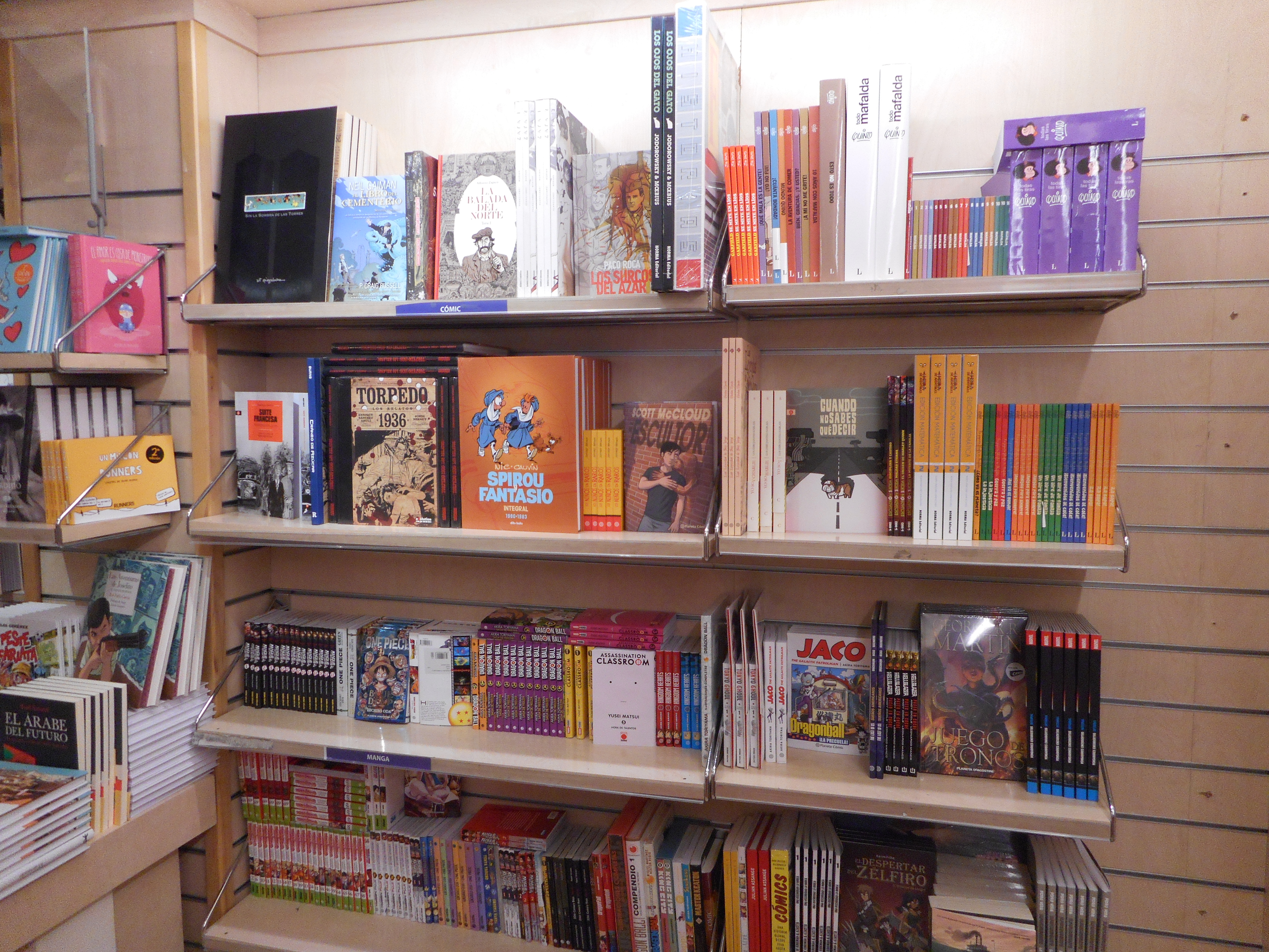 However, while it is probably predictable that Spanish reprints of comics that feature the cast of recent Hollywood blockbusters would be pretty readily available on this side of the Atlantic, I found that the comic book love in Spain is much deeper and broader than the most recent Avengers movie.  Next to the stack of Los Vengadores trades was a shelf full of smaller press comics by Neil Gaiman and Scott McCloud!