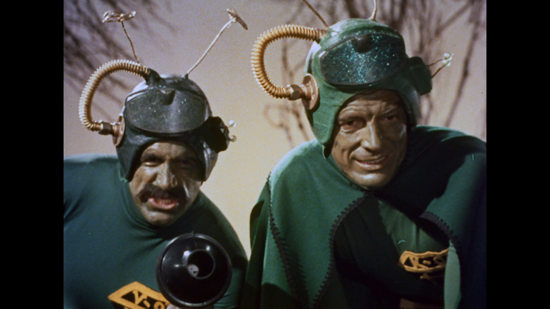 Even by B movies standards, the visuals are pretty rough. The Martians in particular are awful looking, dressed completely in green (green body suit with a green shirt and green briefs or boxers) with green grease paint on their faces that doesn’t match the color of their clothing. They’re also wearing some kind of green helmet out of which their antenna. The antenna appear to be made from poorly shaped and painted tinfoil, which makes me wonder if the budget was so low that the creators couldn’t afford a bent coat hanger.