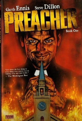 An angel from heaven and a demon from hell share a moment of celestial passion that produces an entity—an idea—called Genesis that is so powerful it could challenge the Almighty himself. Kept incarcerated in heaven, this creature finally breaks free and heads screaming to Earth, decapitating a seraph on the way down. Looking for a human soul, it slams into a preacher in the middle of a crisis of faith, giving his Sunday sermon in a backwater town in the wastes of Texas. The impact obliterates the church, incinerates the parishioners, but leaves the preacher unharmed and with the power of the word of God. This sequence of events sets in motion Garth Ennis and Steve Dillon’s epic series Preacher.