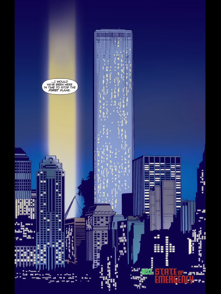 In 2004, around the middle of Y: The Last Man, Vaughan started a second major, creator-owned series:  Ex Machina. Where Y focused on a near future sci-fi story, Ex Machina mixed superheroes and politics, with the main character being a former superhero who has been elected mayor of New York City.  If there was any doubt that Vaughan was a master of comics, Ex Machina removed it by the end of issue one.  Only three years after Sept. 11, Vaughan left us breathless (with what?) and set the tone for the Ex Machina in one page.